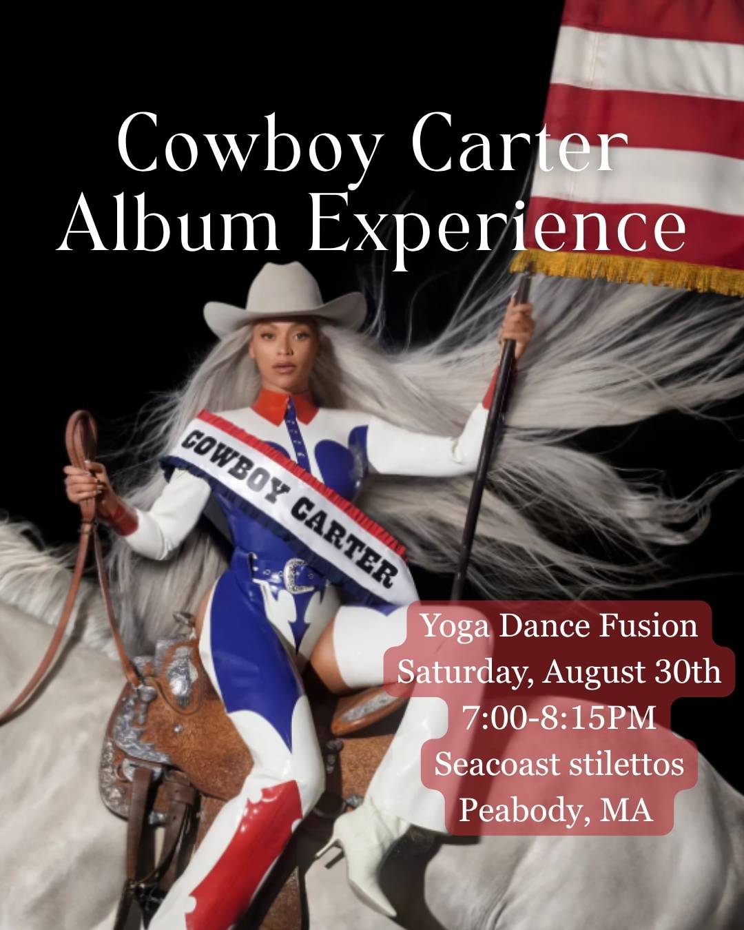 Join us for an unforgettable experience that blends the empowering beats of Cowboy Carter with the fluidity of yoga and the freedom of dance.